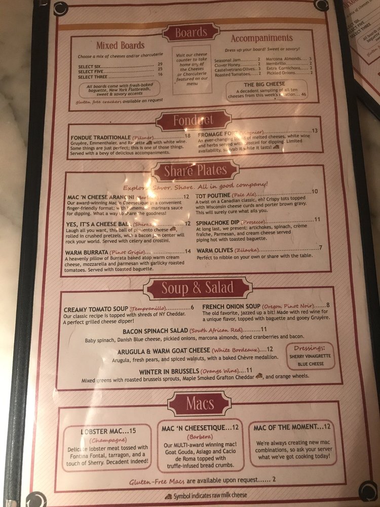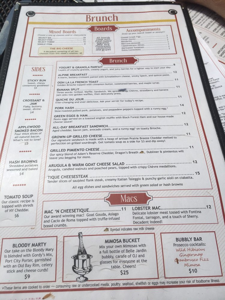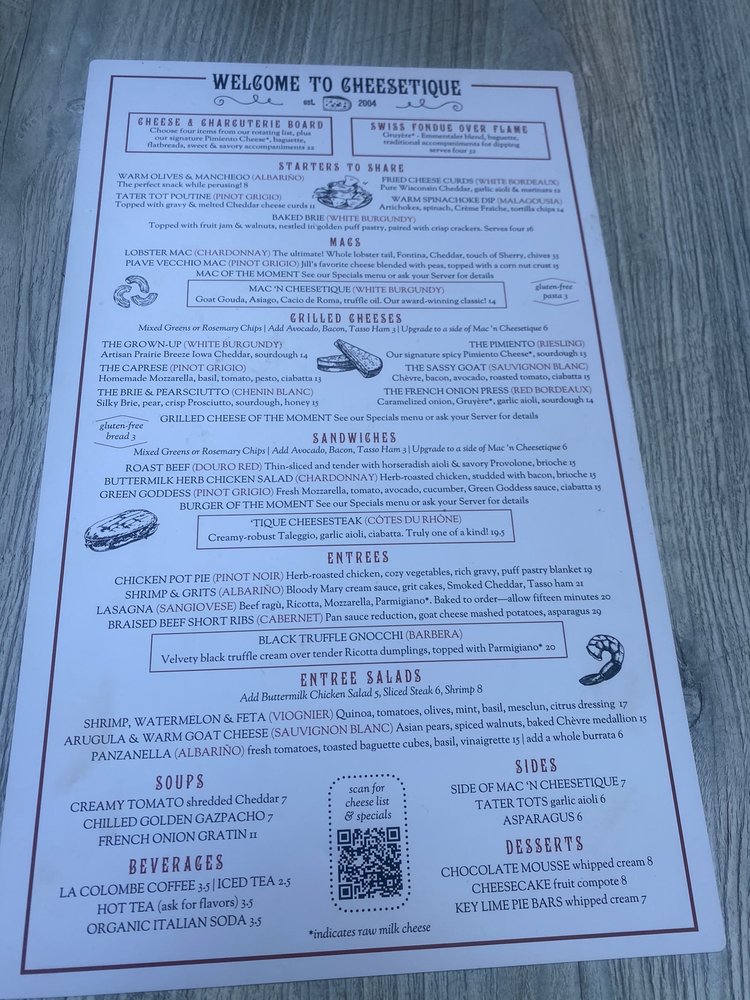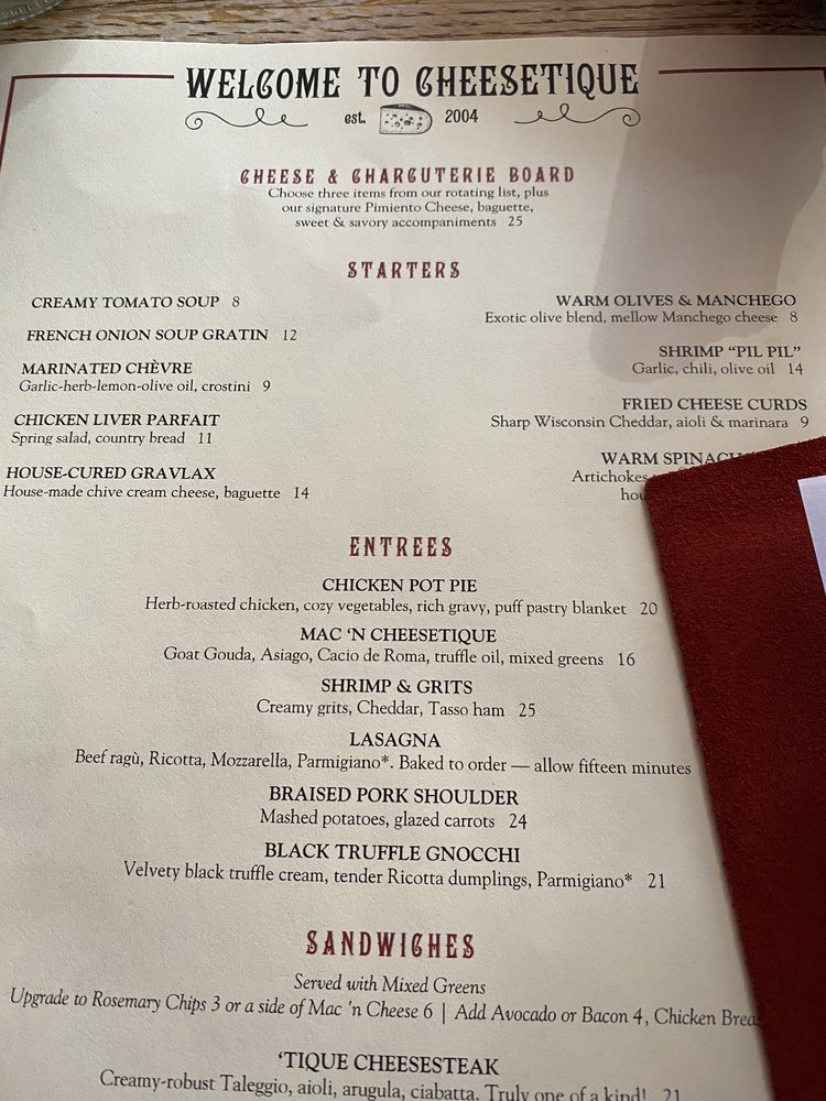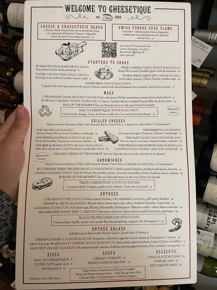 Cheesetique in Alexandria, VA is a must-visit destination for cheese lovers. This cheese shop, sandwich spot, and wine bar offers a range of amenities such as reservation options, delivery, and takeout services. The cozy atmosphere with moderate noise levels and casual dress code make it perfect for lunch or dinner dates. Customers rave about the high-quality cheese boards, delicious sandwiches, and creative comfort food options. The diverse menu includes unique dishes like aged Wisconsin cheddar with port wine, lobster mac and cheese, and a Brie and pear prosciutto sandwich. The attentive staff, extensive wine selection, and great service create a welcoming experience for visitors. Don't miss out on the signature dishes like fried cheese curds, marinated chèvre, and black truffle gnocchi. Whether you're looking for a girls' night out or a romantic date spot, Cheesetique has something for everyone.